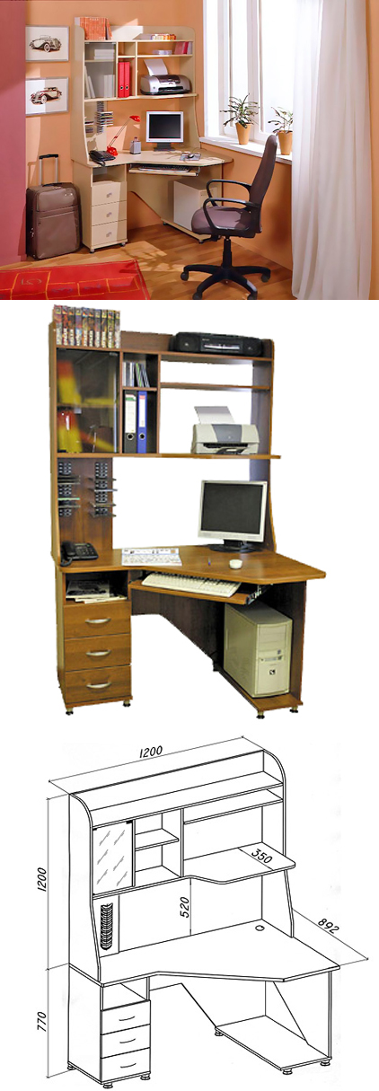 Еще одной характерной особенностью компьютерного стола является то, что каждый элемент компьютера (либо другая принадлежность) расположен в специально отведенном для него месте. Далее необходимо составить схему деталей будущего компьютерного стола, определить их размеры, подготовить детали, а также материал для обработки кромок, приобрести необходимую фурнитуру, насверлить сборочные отверстия и выполнить сборку. Иногда предлагают тумбу или комод, над которыми размещается зеркало, выдержанное в том же стиле, что и остальные предметы. Еще один способ ухода за полированной мебелью